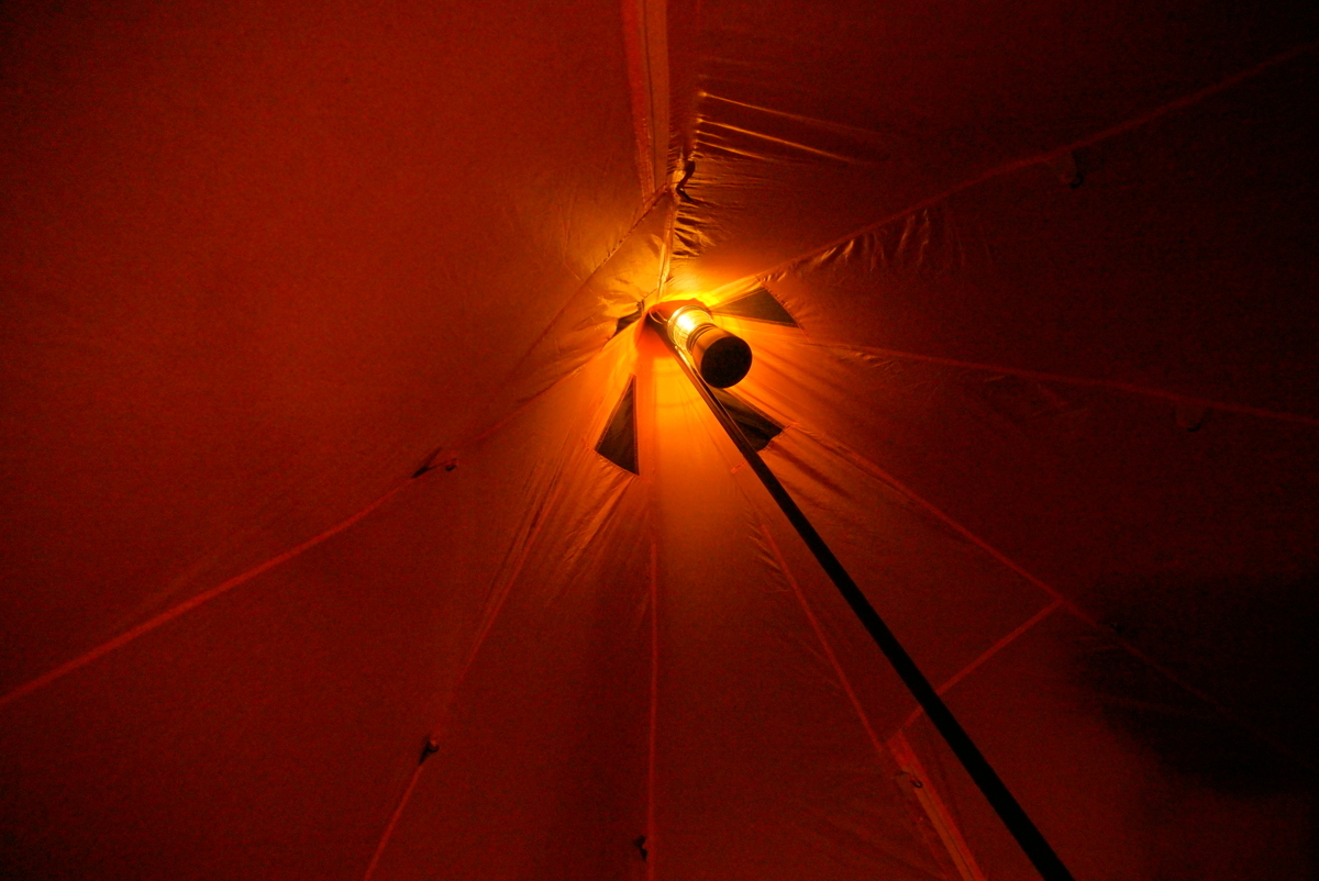 テント上部のベンチレーション付近にガソリンランタンを掛けようものならたちまちテントが燃えてなくなります。