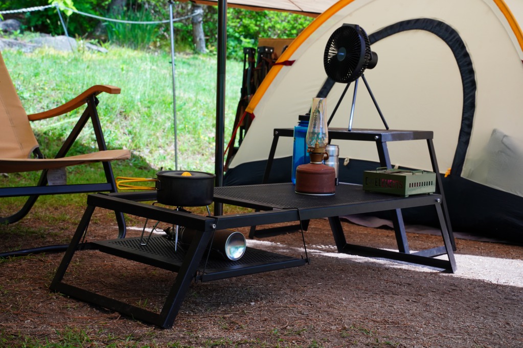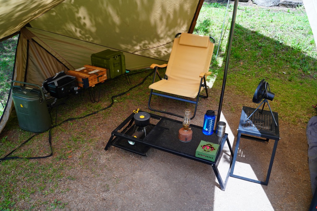 テント内レイアウトの両サイドは前々回と同じですが、ポール付近のテーブルは久々のauvil製品を引っ張り出してきました。