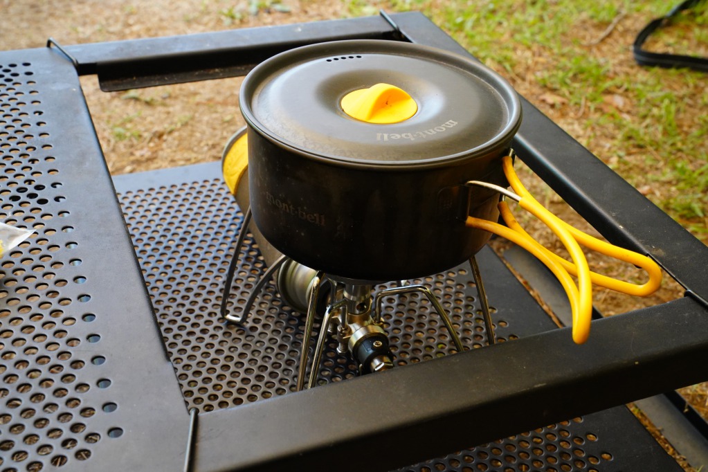 昼食はレギュレーターストーブで作ります。この簡易調理場がめちゃくちゃ良い、座った状態から見下ろす視点がとても楽です。