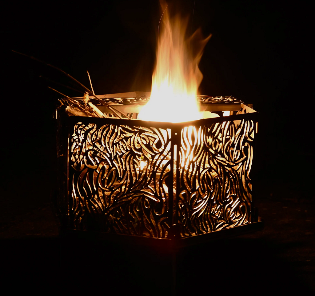 写真の焚火台は大型の「STEN FLAME GLAMPシリーズ」で他には手のひらサイズの「STEN FLAME LIGHTシリーズ」、2021年おもてなしセレクションを受賞した「Bonfire Grill」などレーザー切断加工により特徴的な柄の焚火台があります。