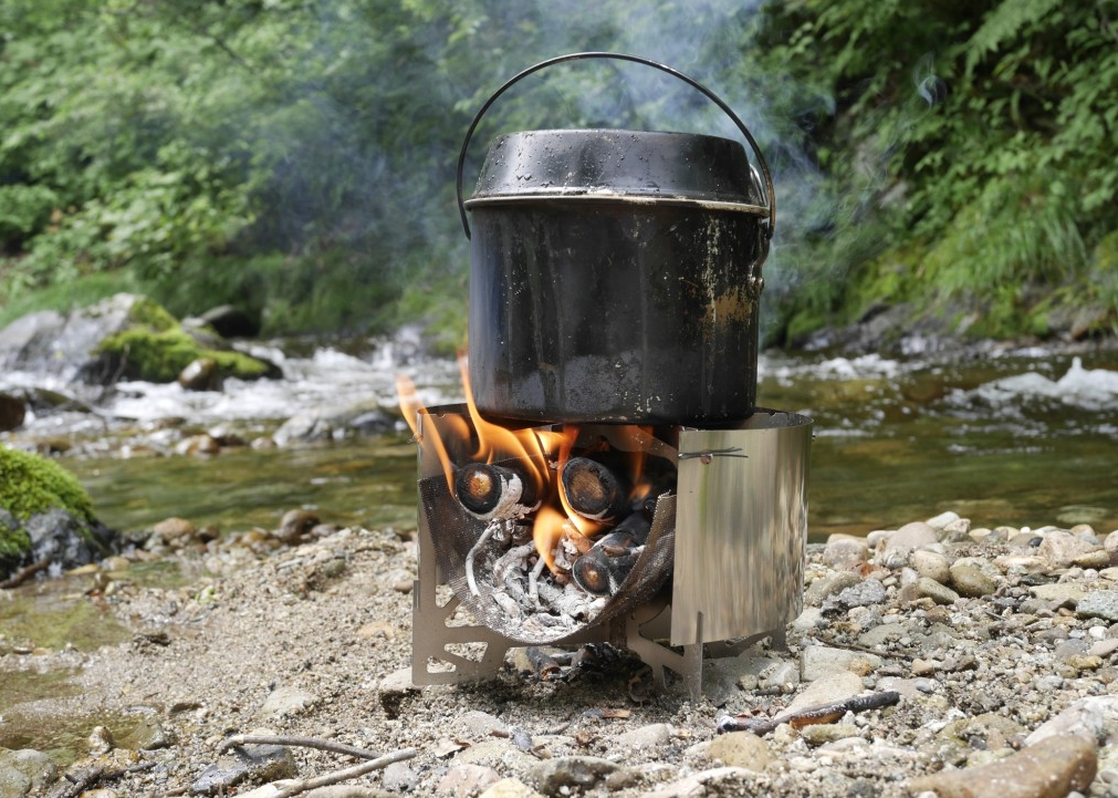 「フィビストーブ」はスイス発のコンパクトネイチャーストーブで、煙突効果で湿った木材でも問題なく着火します。収納袋はA4サイズ程の大きさになり持ち運びも簡単。