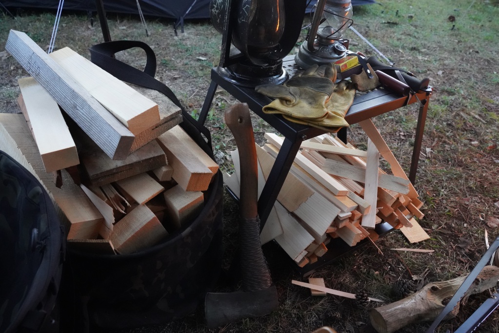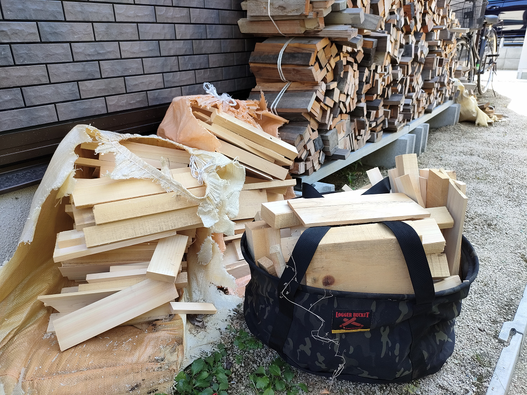 こういう時に薪キャリーバッグが活躍します。最近オレゴニアンキャンパーのロガーバケットを買って、正直使う前はそこまで必要性を感じませんでしたが動かす時楽だし、常に地面から薪が離せて便利。あと荷物入れになったり何かと出番が多い。