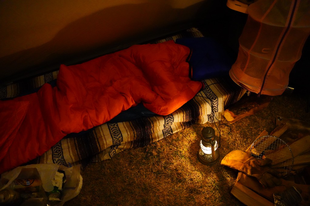 というかそもそも寒いと本当に眠れないです。写真はコット→激安マット→ラグ→3シーズン用シュラフとその時の最強装備で冬の夜に臨んだのですが寒くてダメでした。