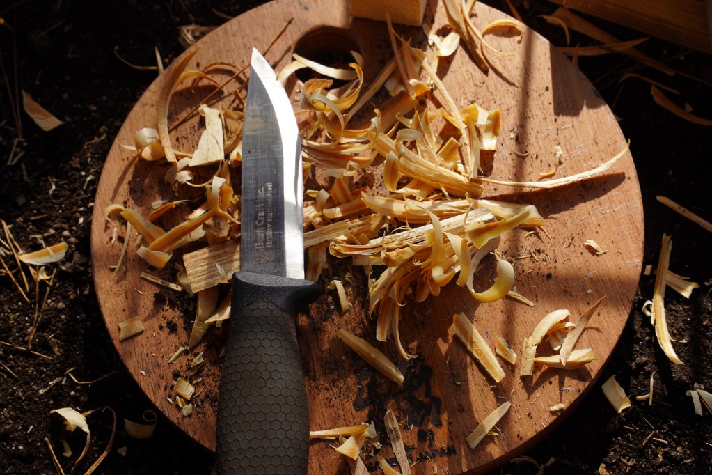 一度湿った薪は普通の薪より長めに火に当てないと燃えてくれないのでひたすら焚き付けをナイフで作っては焚火台に放り投げる作業を続けます。あとナイフで削って濡れてない部分を出すしかない。