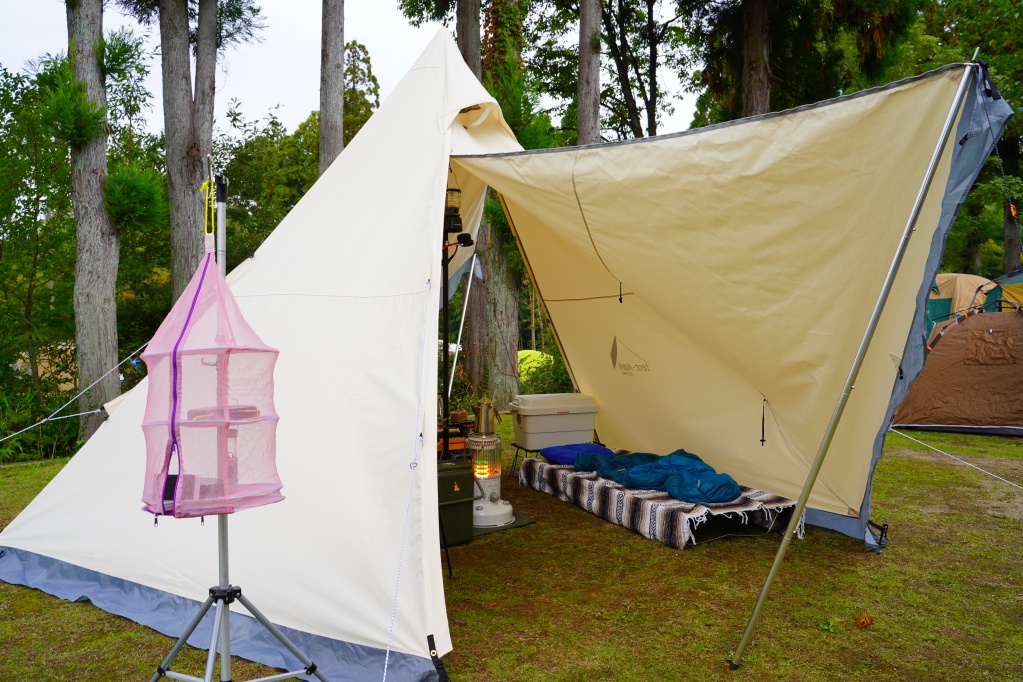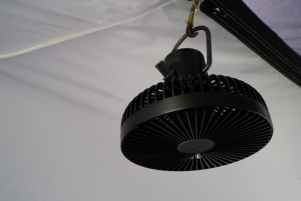 これでも翌朝少し結露で濡れている事があるので、朝一番にベンチレーション全開、前幕&後幕全開、サーキュレーターがん回しておけば結構早く乾きます。
