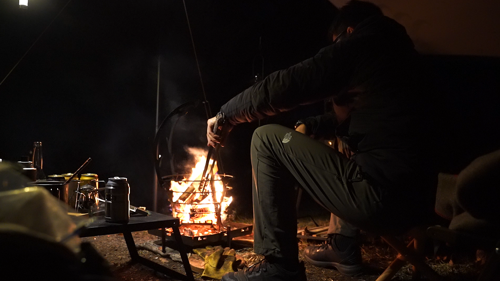 お酒を飲みながらひたすらグルグルファイヤーで焚火を楽しんでいます。複数の薪を一気に入れたり、あえて太い薪を入れたり炎で遊ぶ。