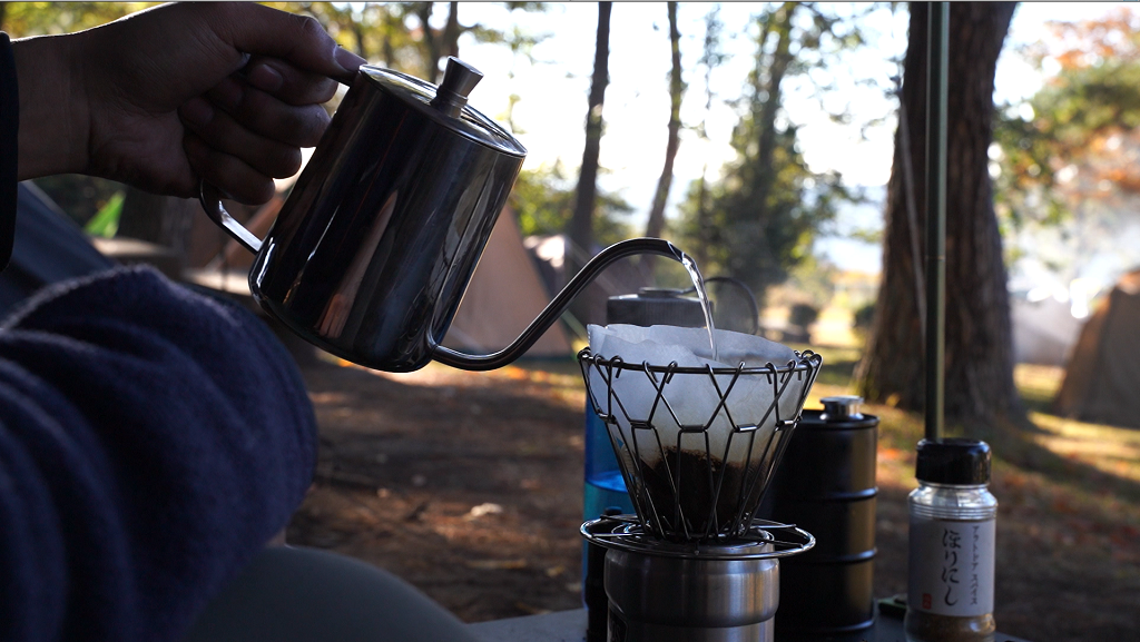 フィルターが固定されないからお湯で崩れます。専用フィルターがあるのか、僕の組み立て方がいけないのかよくわからない。次は家で使っているドリッパー持って行こうと思います。