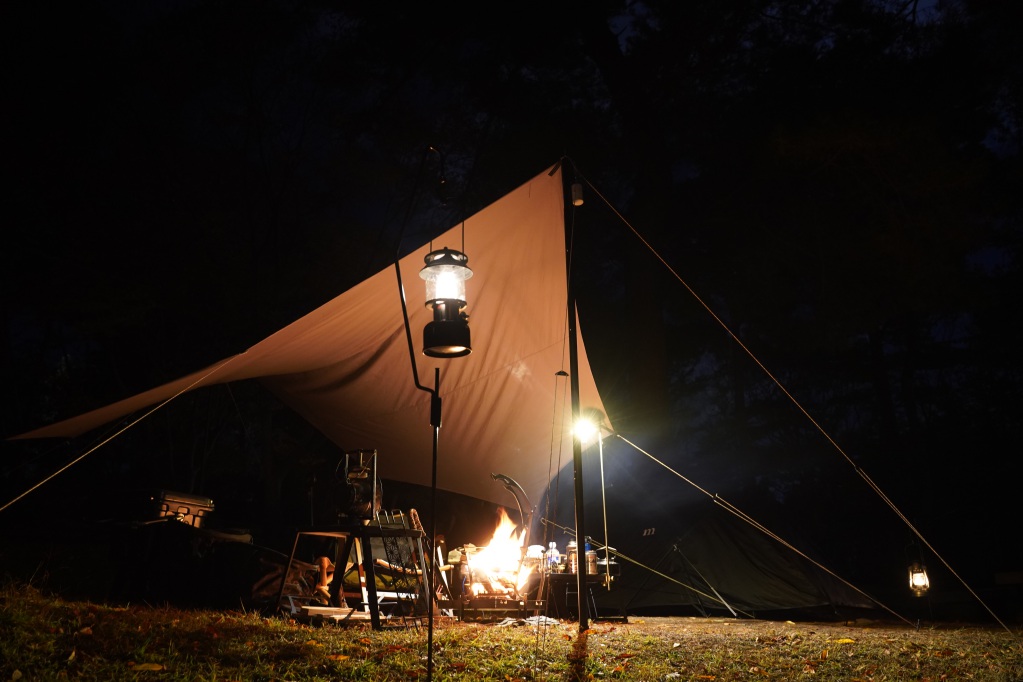 暗い時間が長いと焚火やランタンが楽しめる反面、気温が低くなるので防寒対策はしっかりしないといけません。ダウンジャケットを着てほぼ冬キャン服装で臨みます。