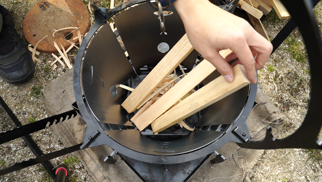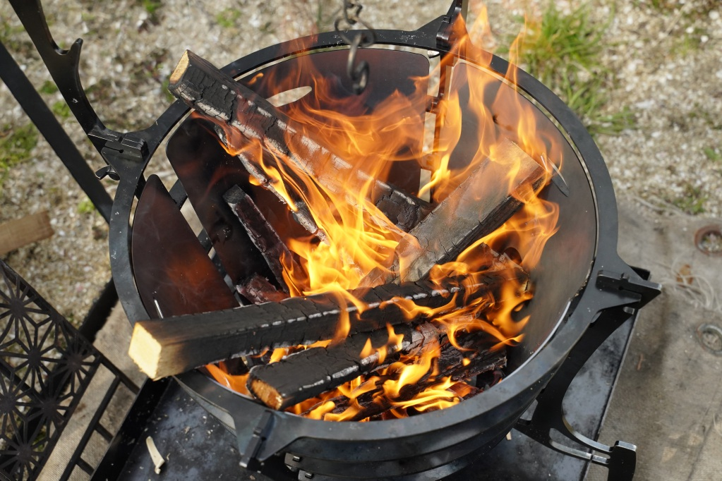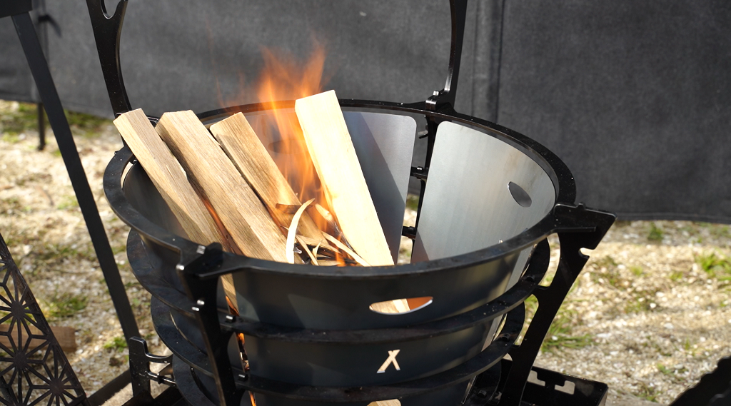以前は薪をリングの隙間から通して入れる事ができましたがFUBOUを付けると全部上からのみ。薪の位置を細かく変えたい時や長い薪を燃やす時はちょっと困る。