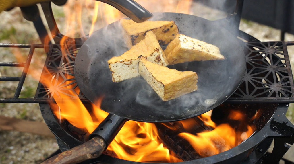 たき火フライパンで調理もしてみました。ちょっと火力が強すぎて所々焦げちゃいましたが風の影響がない分しやすかったです。