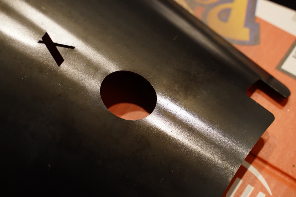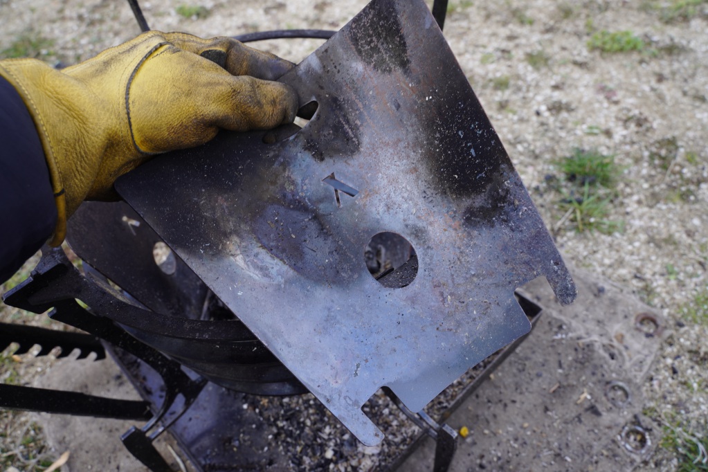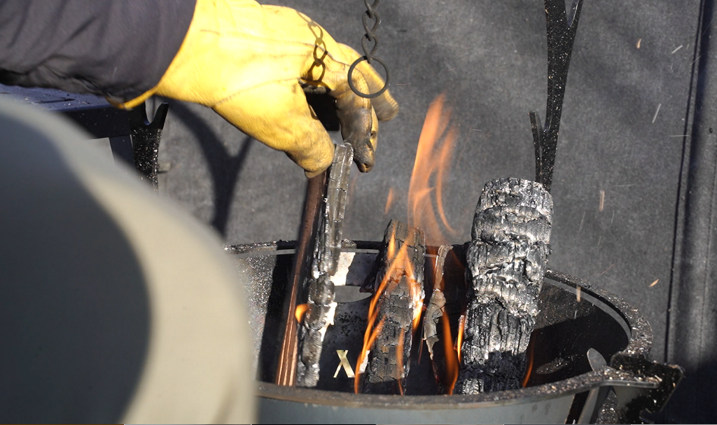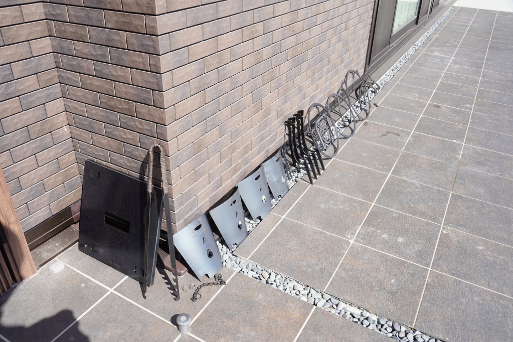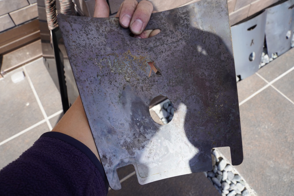 下のホールは着火する際に助かりますが、上のホールは正直使わない。一応火ばさみで持てるように開いていますが、一枚だけでも火ばさみで持つにはしんどい重さなので僕は革手袋で持ちます。